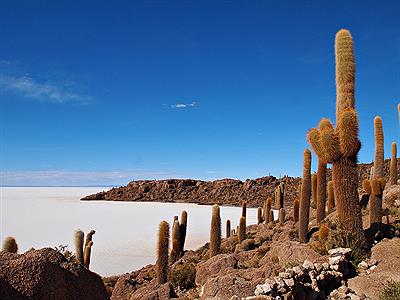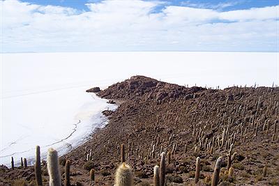 En medio de la inmensidad del salar asoma esta exótica y escarpada formación, que alberga un ecosistema cuyos representantes mas visibles son cactus gigantes (Echinopsis Atacamensis) que pueden llegar a medir más de 10 metros de altura. Cuando el salar se inunda, generalmente en Enero y Febrero, la silueta de la isla tiene la forma de un pez