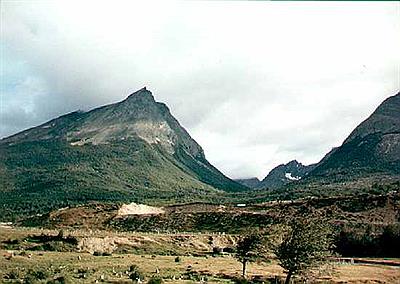 Vista Cerro Delta desde ruta a Parque Nacional Tierra del Fuego ( se puede apreciar una depresión entre cerros, es de origen glaciario “los hielos del cuaternario descendieron por los valles intercala...